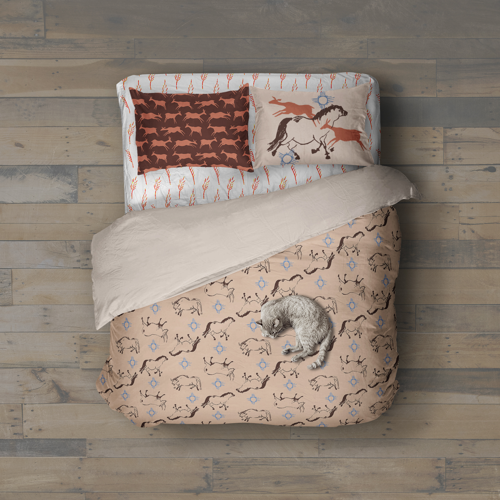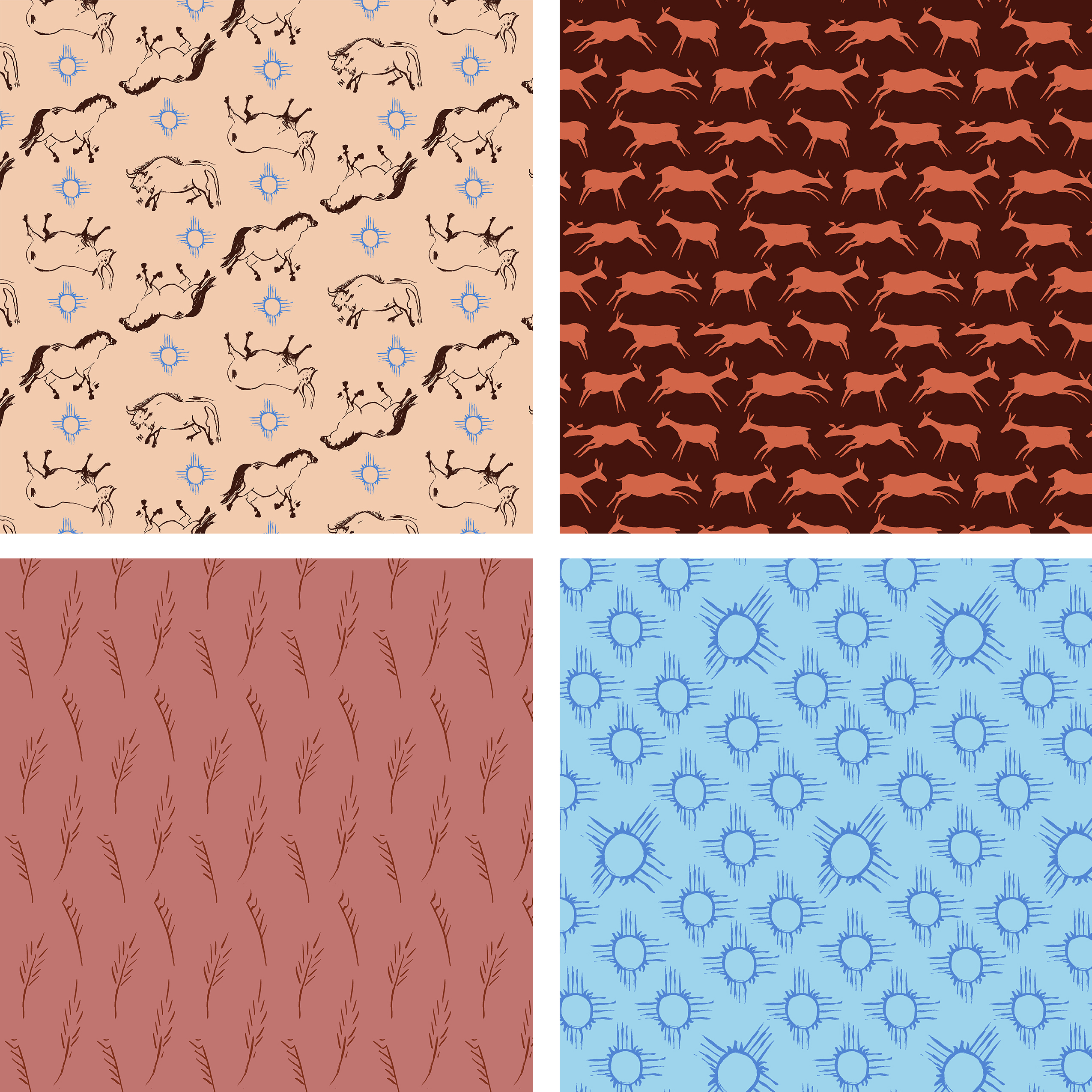 This year, I took Surface Design with the lovely Lisa Perrin. She was a new professor in the illustration department, and I’m grateful that I gave her class a shot. She was wonderfully supportive and helpful, and I feel like I can’t talk about my work without giving her a shout-out. The above collection was called Subterrane, and was based on my love of cave paintings. I had a particular amount of fun doing mockups of various products for this one.