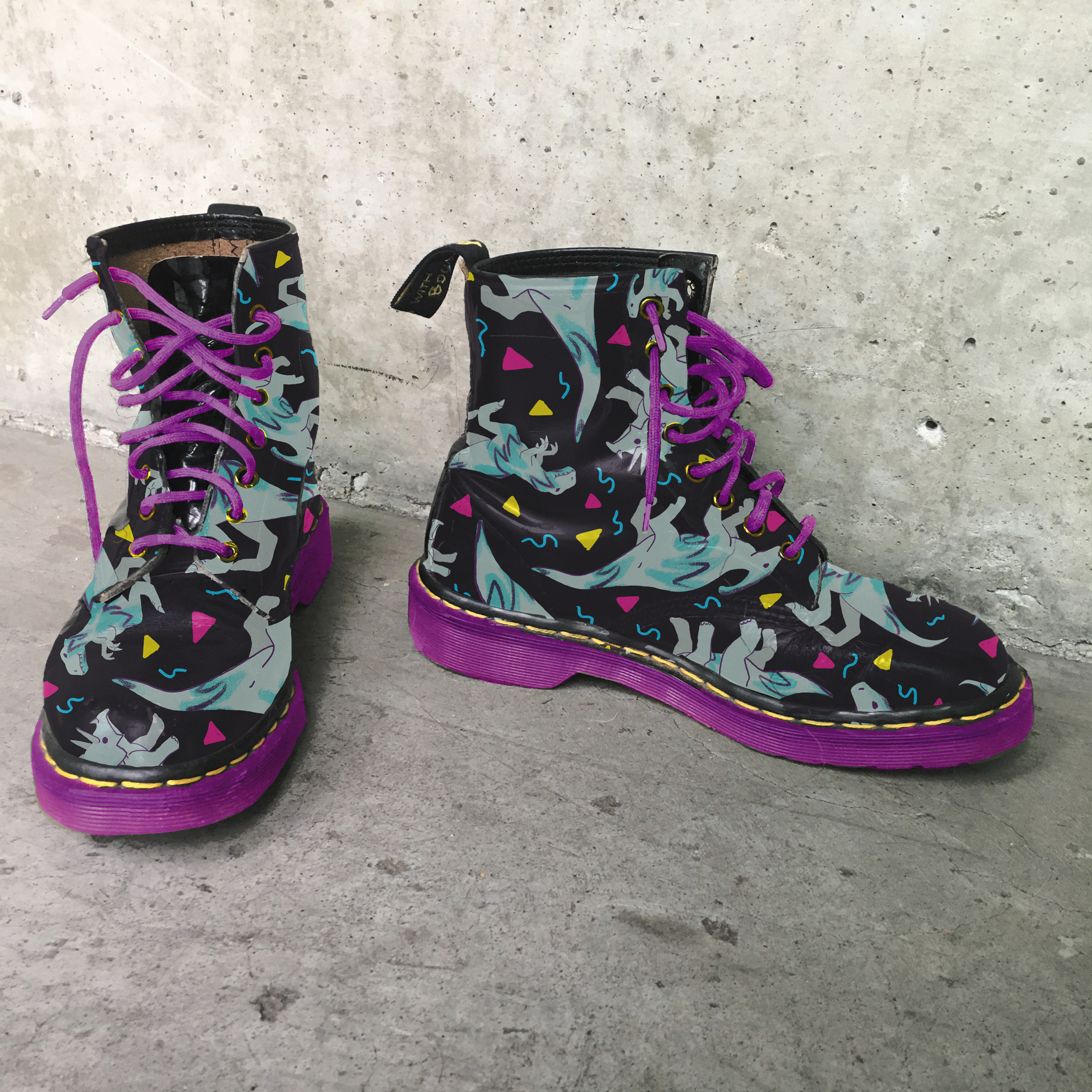 Above is a piece I’m still really proud of, to be honest. Something about dinosaurs and arcade carpets just works well together. I really wish my docs were as cool as they are in the comp I made on the right. Perhaps someday I’ll teach myself how to make boots and see if I can bring it to life.