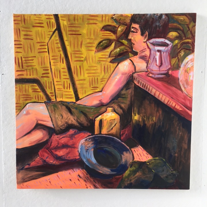 This painting of my friend Eli is quite possibly my favorite piece from this year! It was done in oil paint on a hot pink background. Looking back on it, I can see how this painting informed a lot of my future paintings!