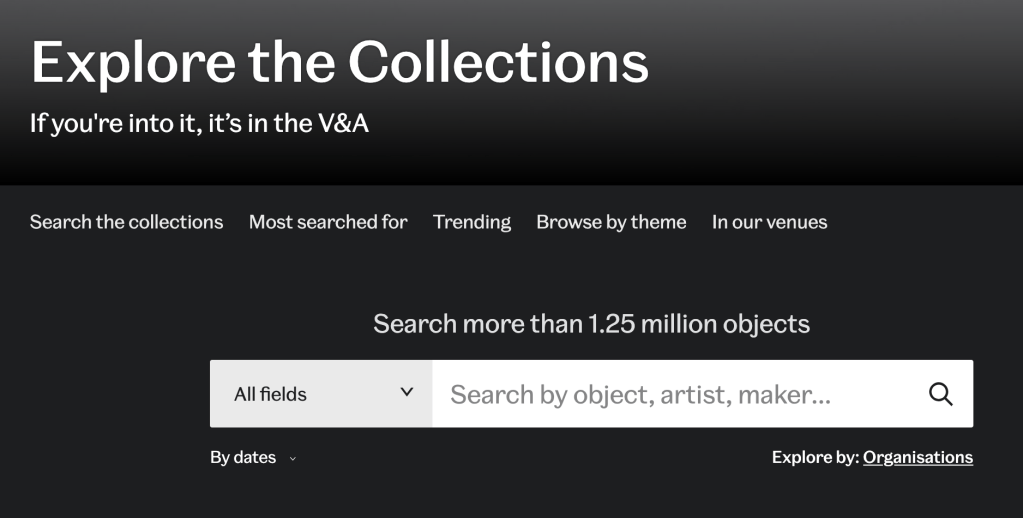The V&A Museum Collections database is vast and an excellent place for visual artists in particular to go to for inspiration. In this case, I do mean strictly for inspiration.