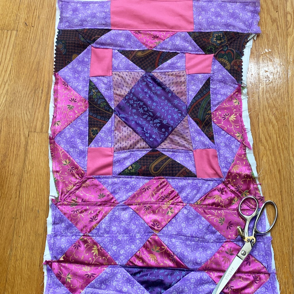 I spent the most time getting the center square even and my corners lined up properly. The center square was silk, which made this a challenge and a half. Silk will slide all over a sewing machine if you’re not careful.