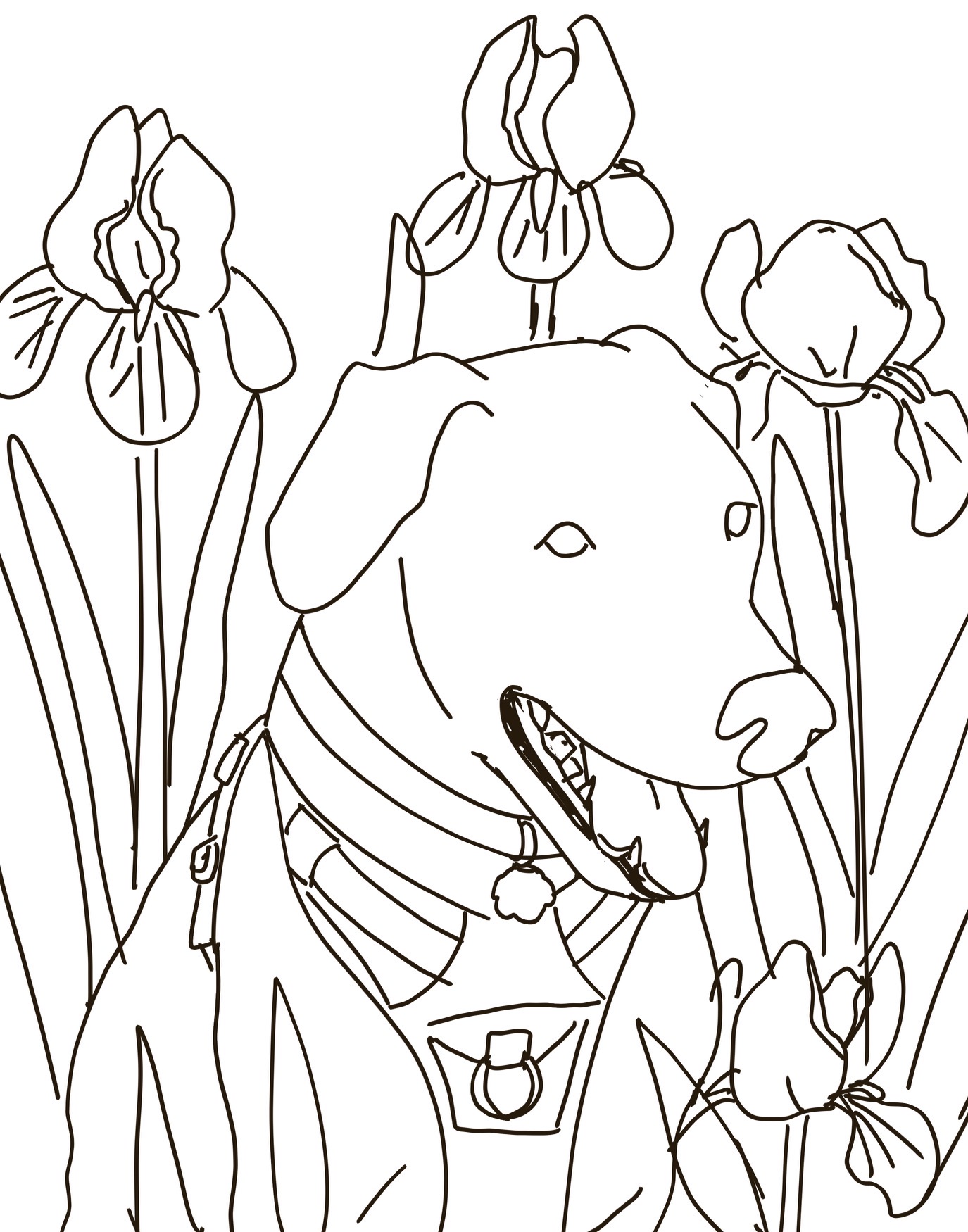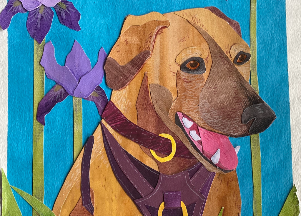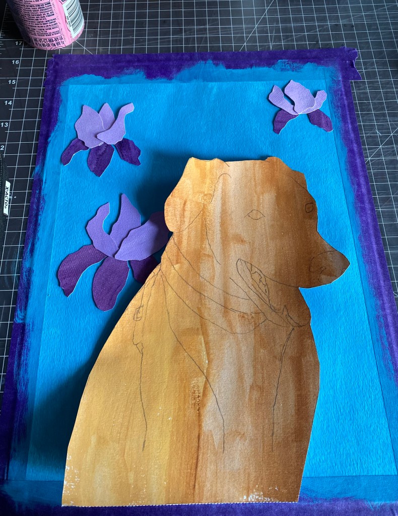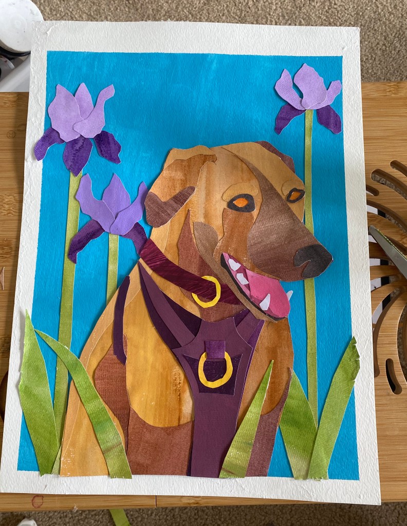Here, I was working on the harness details and getting ready to glue the entire dog to my blue paper with the irises I’d made.