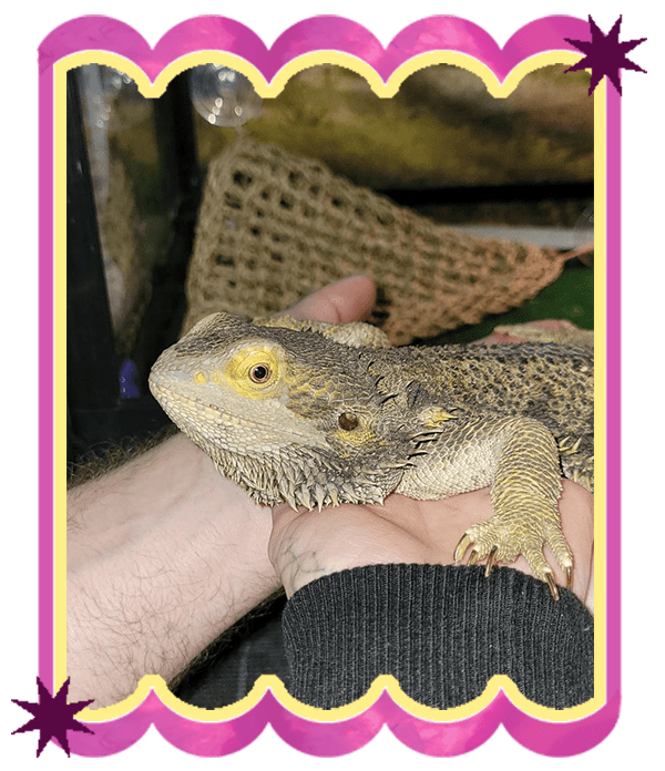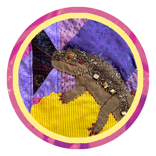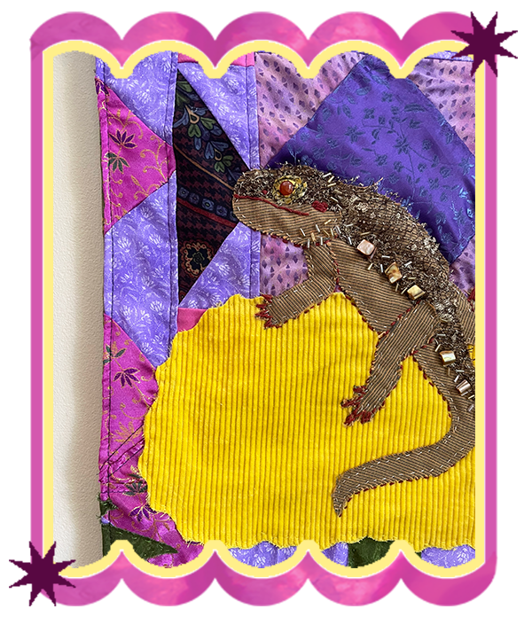 Detail from quilted tapestry done for a friend of her bearded dragon, Sobek